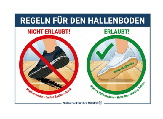 Unsere Bitte an die Teams: Wir bitten alle Übungsleitenden, ihre Gruppen zu sensibilisieren. Bitte kontrolliert im Zweifel vor dem Training kurz die Sohlen. Wer ungeeignete Schuhe trägt, kann zum Schutz des Bodens leider nicht am Training oder Turnier teilnehmen.